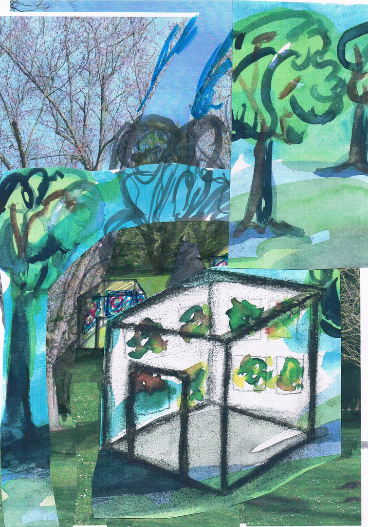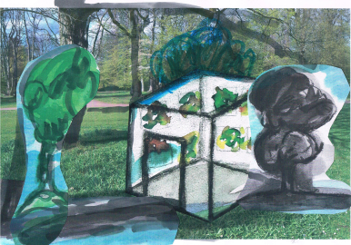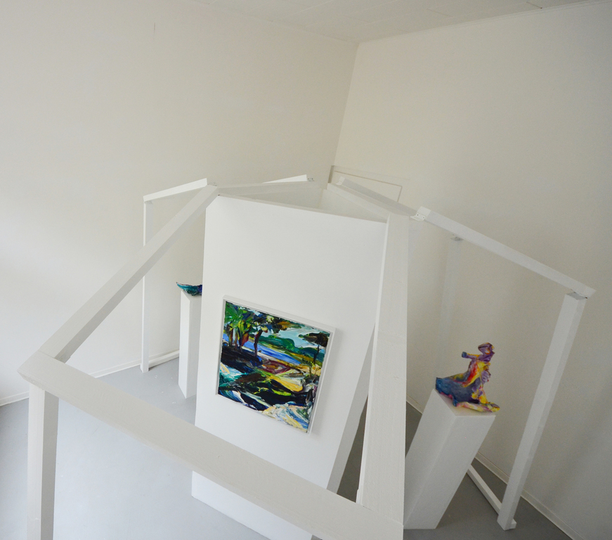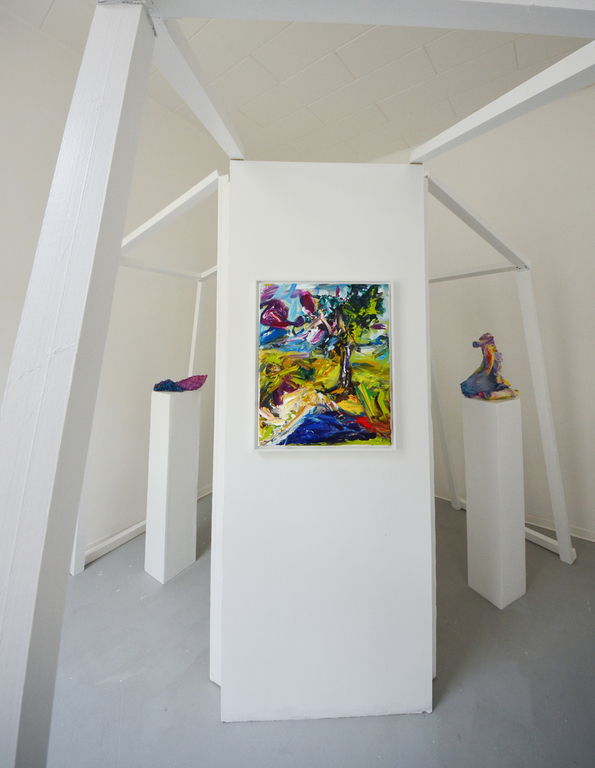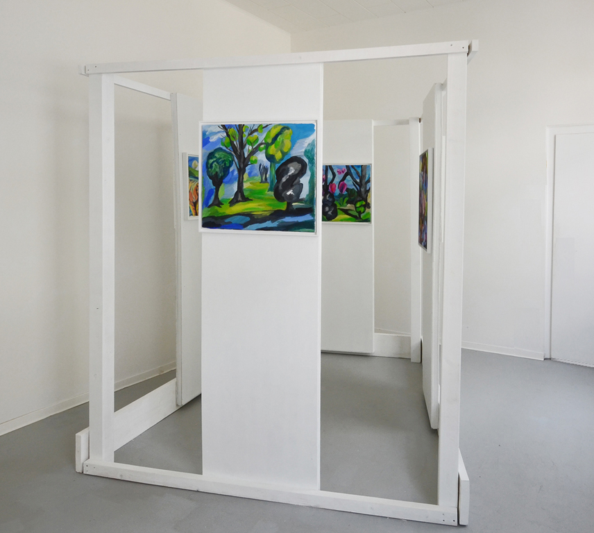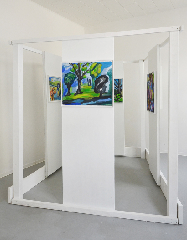Wo fängt die Abstraktion von Motiven an und wie kann eine Landschaftsgestaltung Erweiterungen erfahren? Welche Zusammenhänge und Gegebenheiten werden gefiltert und konzentriert in Farben und Formen aufgelöst? Das sind Fragen, die sich aus dem Arbeitsprozess an den Projekträumen ergeben haben. Bereitet wird ein Diorama mit den komponierten Kunstobjekten in der Kulturlandschaft des Parks. Die Objekte gebärden sich deplatziert und sind doch konzentriert in die Umgebung gesetzt. Die Installationen haben die Form von Zelten. Temporär begrenzt an einem Ort und improvisiert. Es erscheint stabil und durchlässig zugleich. So auch die Rahmen der Präsentationsräume, welche die Bilder und Objekte einfassen. Eine Brücke zwischen unterschiedlichen Gestaltungsweisen der abstrakten Umsetzung in den gezeigten Objekten.