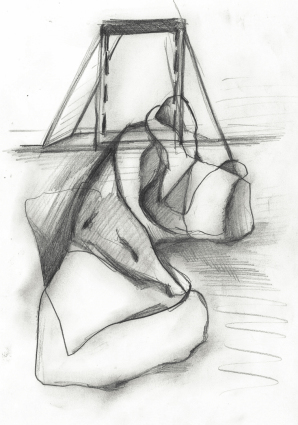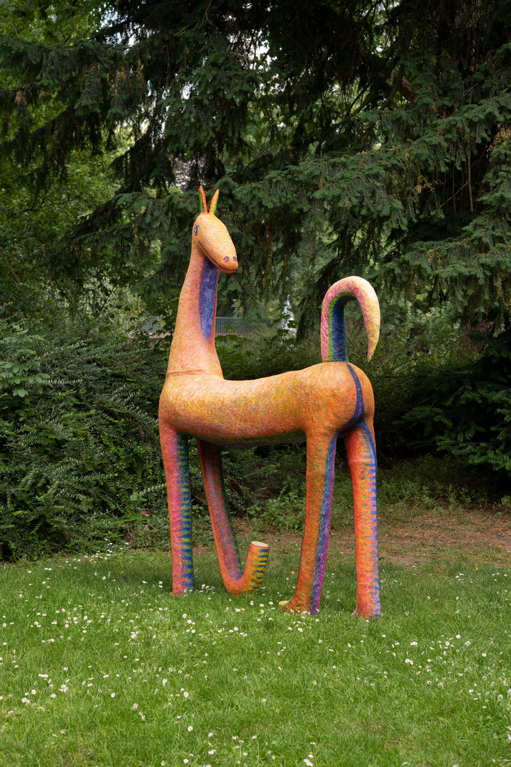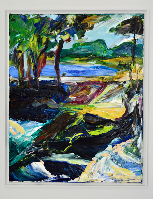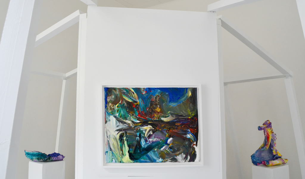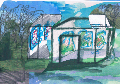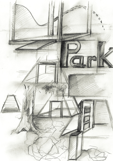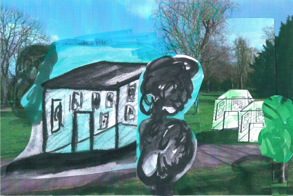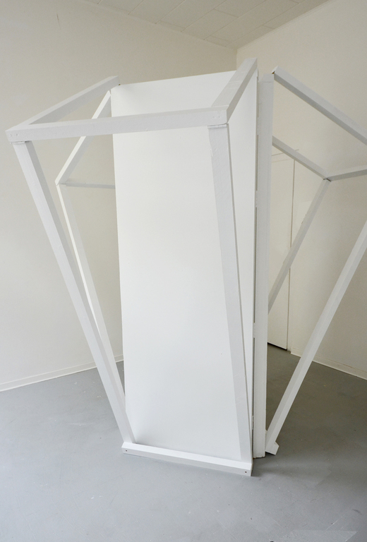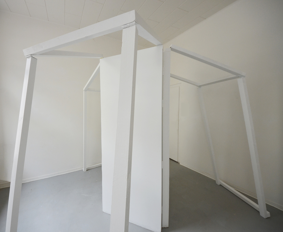 Wo fängt die Abstraktion von Motiven an und wie kann eine Landschaftsgestaltung Erweiterungen erfahren? Welche Zusammenhänge und Gegebenheiten werden gefiltert und konzentriert in Farben und Formen aufgelöst? Das sind Fragen, die sich aus dem Arbeitsprozess an den Projekträumen ergeben haben. Bereitet wird ein Diorama mit den komponierten Kunstobjekten in der Kulturlandschaft des Parks. Die Objekte gebärden sich deplatziert und sind doch konzentriert in die Umgebung gesetzt. Die Installationen haben die Form von Zelten. Temporär begrenzt an einem Ort und improvisiert. Es erscheint stabil und durchlässig zugleich. So auch die Rahmen der Präsentationsräume, welche die Bilder und Objekte einfassen. Eine Brücke zwischen unterschiedlichen Gestaltungsweisen der abstrakten Umsetzung in den gezeigten Objekten.