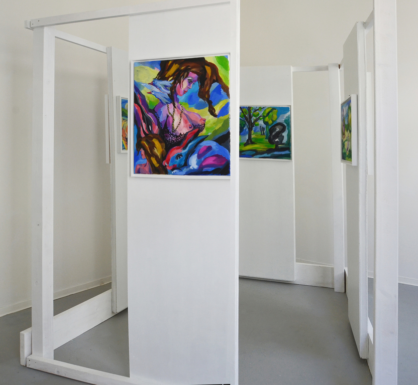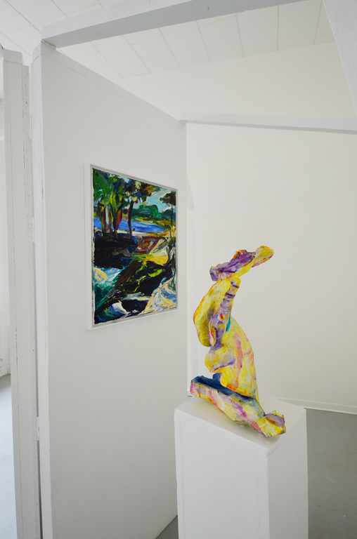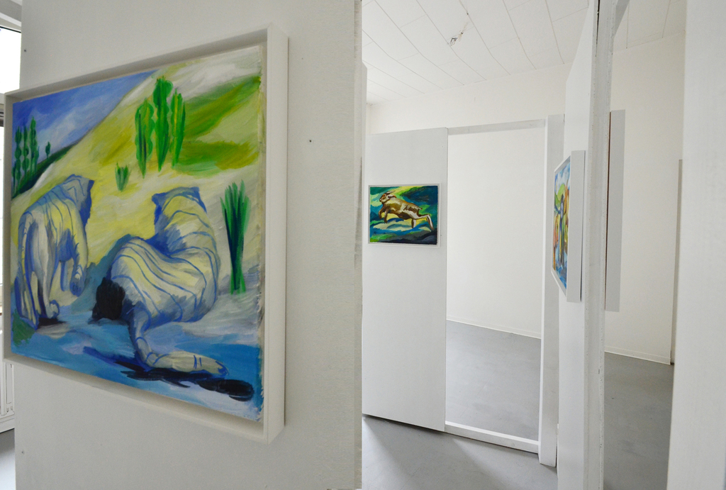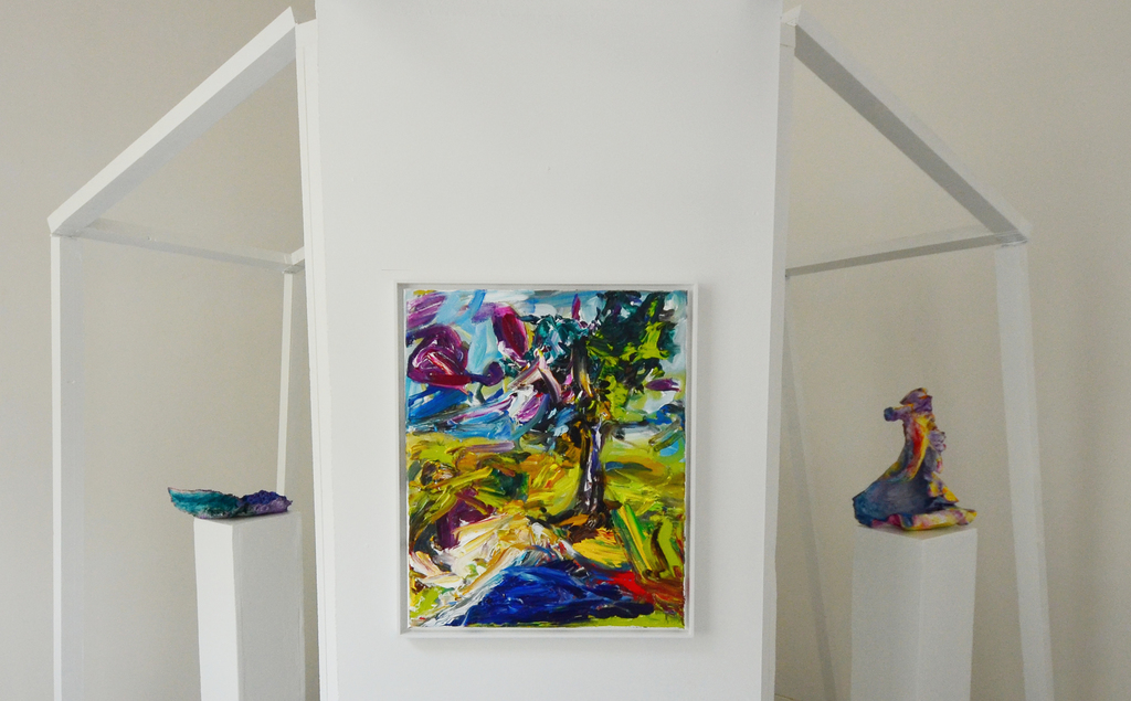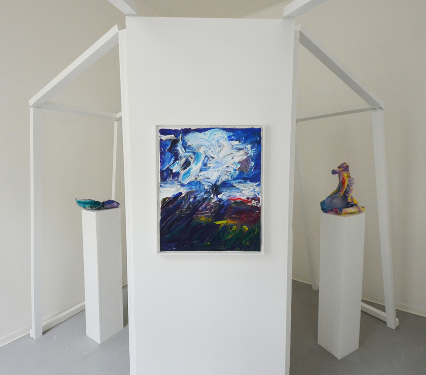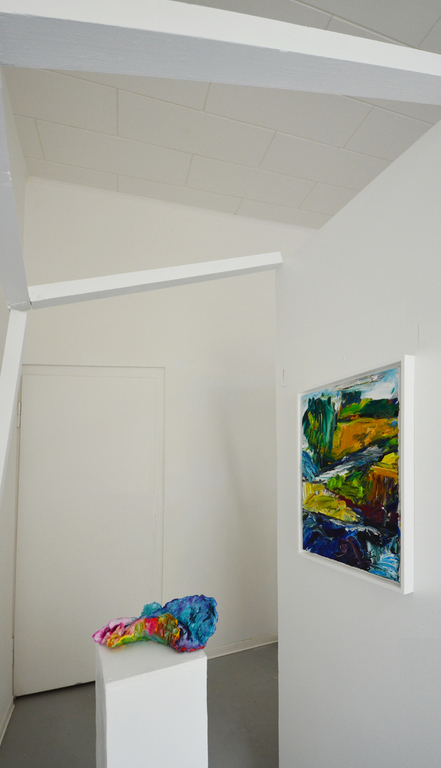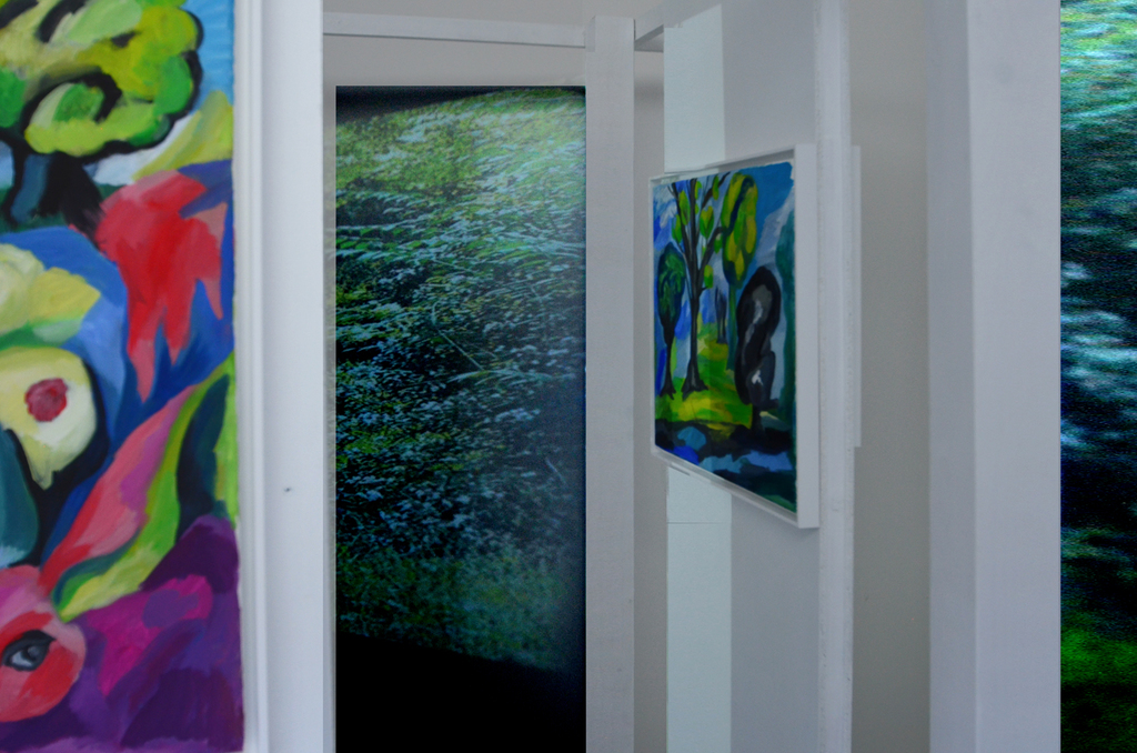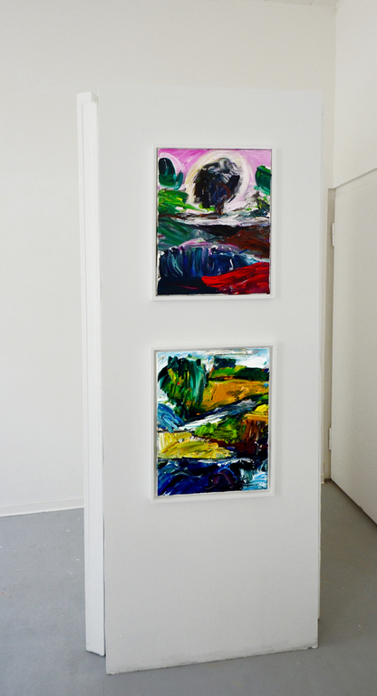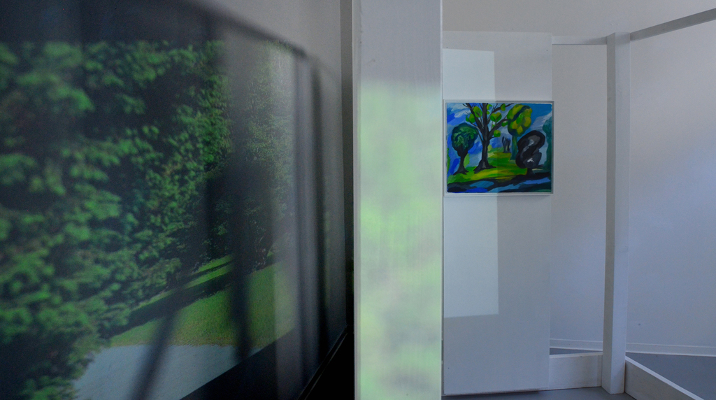 Die Atmosphäre der Umgebung wird komponiert und gleichzeitig verändert. Das Energiegebilde der Landschaft erweitert sich durch die Kompositionen der Bilder. Bäume, Pflanzen und Tiere wiederholen sich in den Bildmotiven und den Farben und werden so hervorgehoben, konzentriert und abstrahiert. Die Bedeutungsebenen der, mit Farben, erzeugten Motive in den Bildern werden wahrnehmbar angereichert und so in die Bildlogik des Kunstkontextes übersetzt..Die aufgebauten Räume, die Erinnerungen an tempelähnliche Formen wachrufen, grenzen sich einerseits gegenüber dem Umraum ab und bilden in sich einen eigenen, geistigen, eher zeitlosen Kosmos. Andererseits öffnen sie sich ihrer Umgebung, nehmen deren Atmosphären auf und komponieren diese neu. So entsteht eine Art Raum im Raum Situation. Die Räume treffen aufeinander, grenzen sich gegenseitig voneinander ab, verbinden sich miteinander und entstehen auseinander.