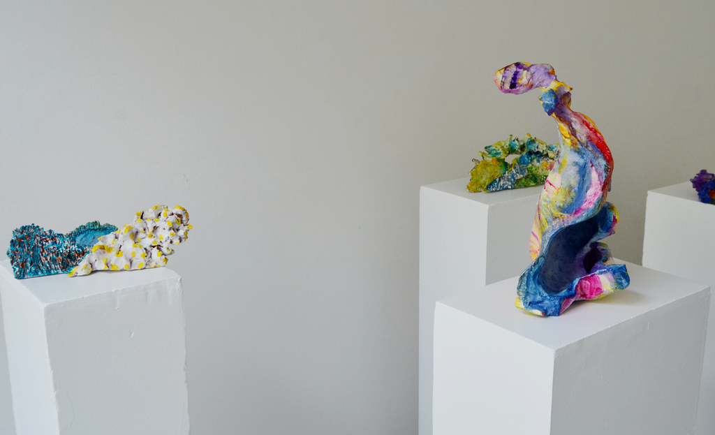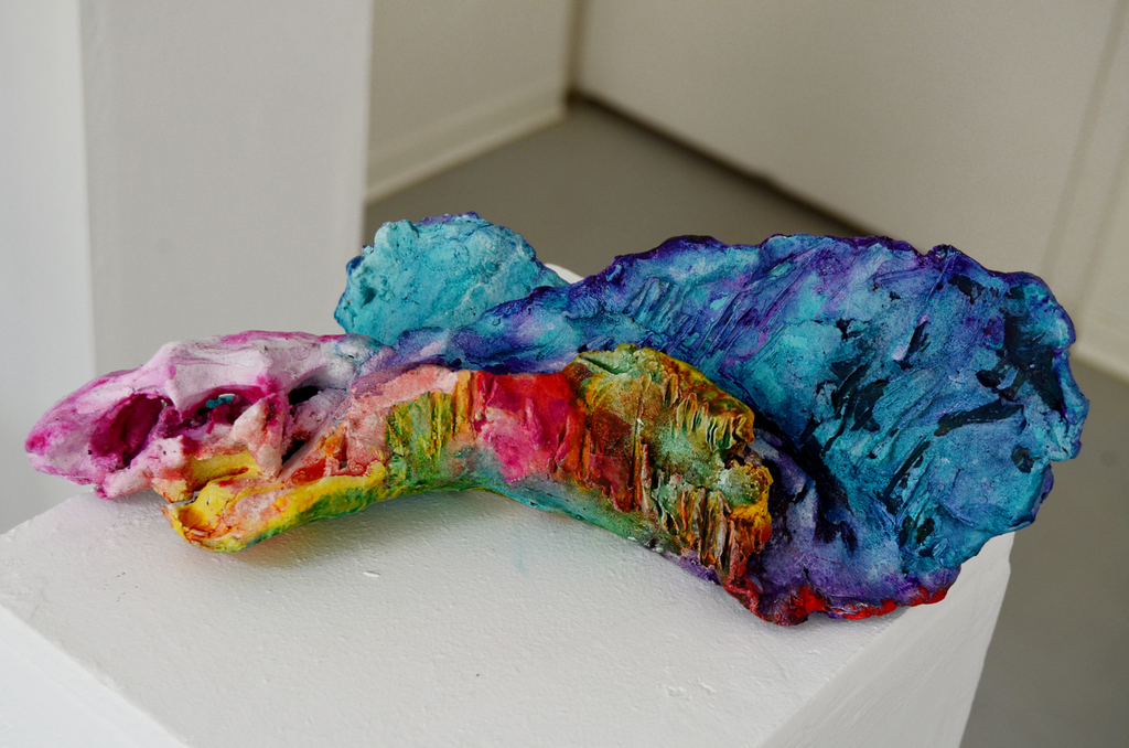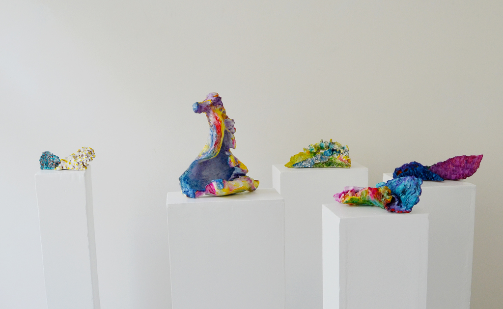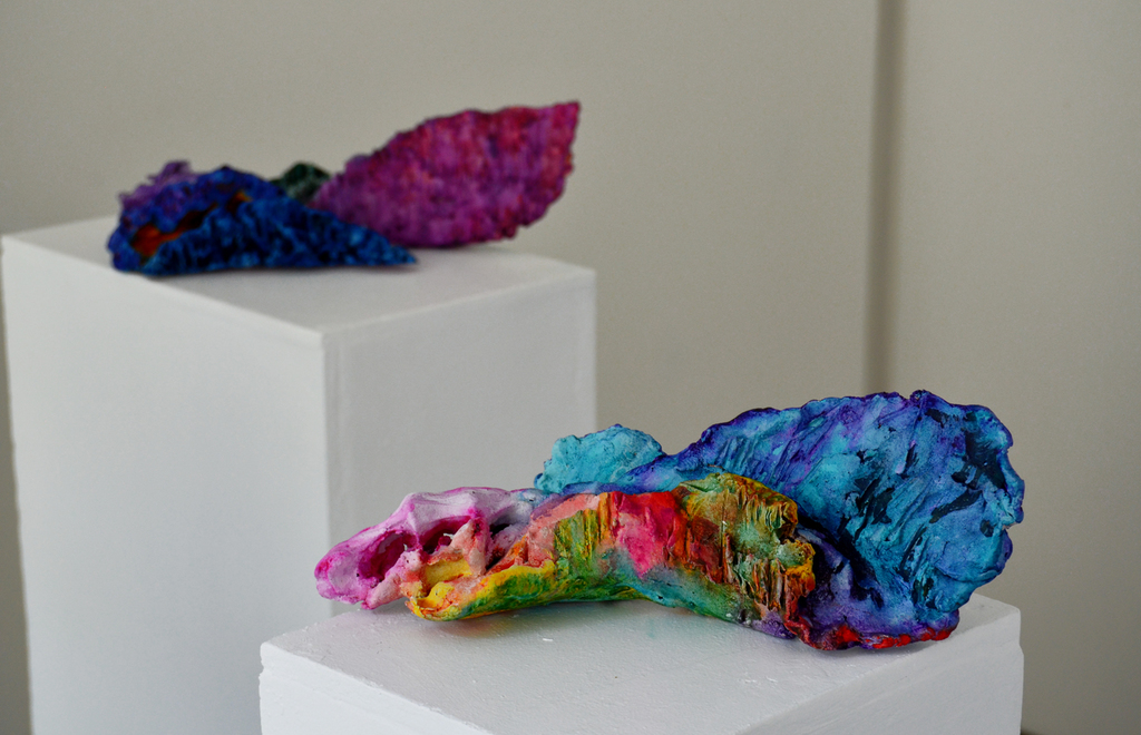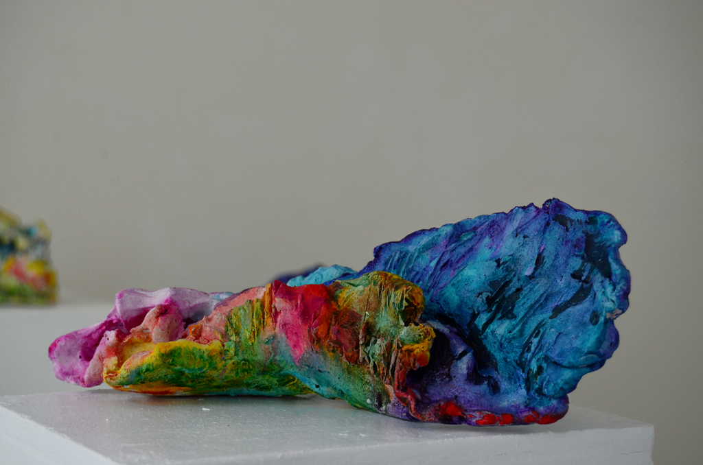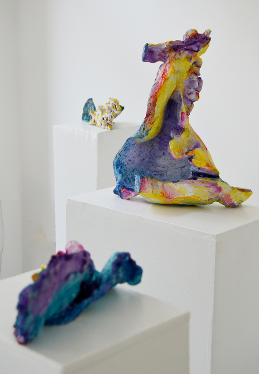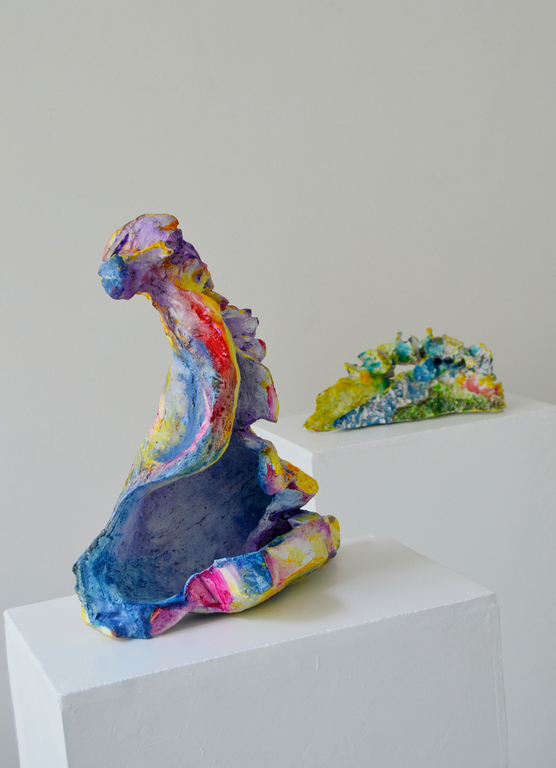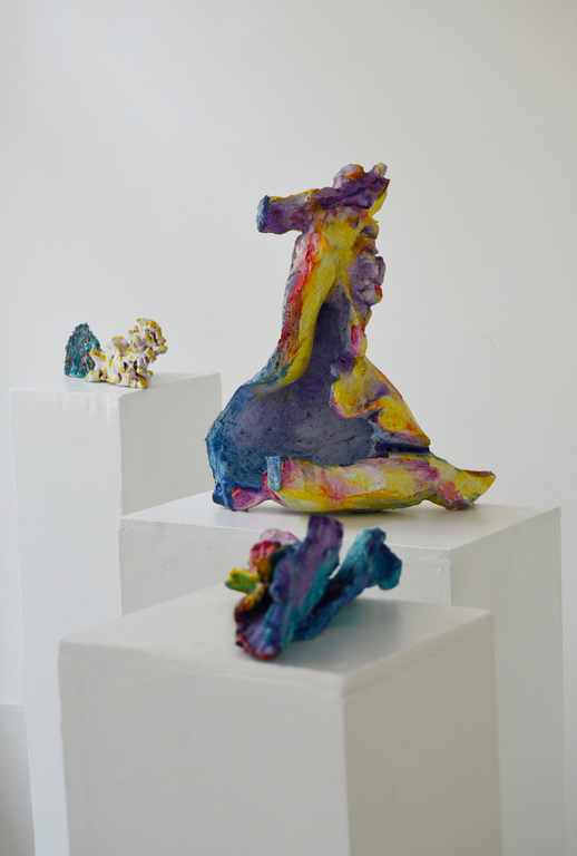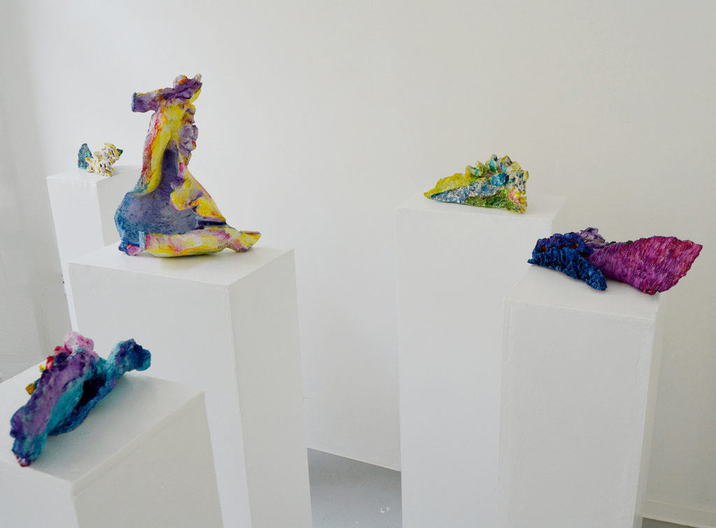 Die Inszenierungen erinnern an Zusammenstellungen, die aus der Dunkelheit und Geheimnissen genauso gespeist werden, wie aus der geometrischen Klarheit der Helligkeit der nuancierten Weißtöne. Die Farbzusammenstellungen ordnen das Chaos der ineinander fließenden Konzeption der Gips- und Tongebilde, oder verstärken die Haptik der Oberflächen.