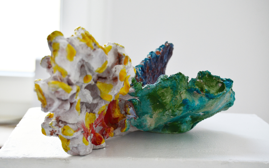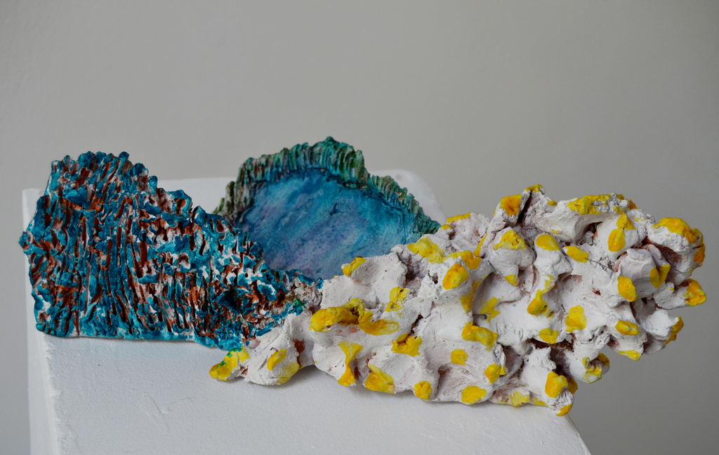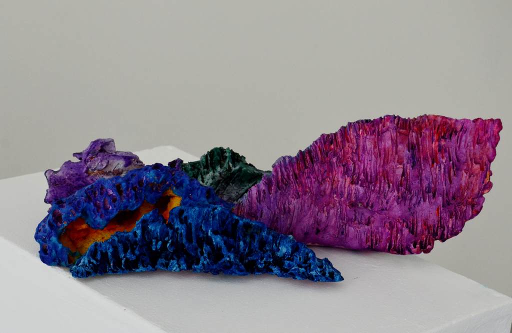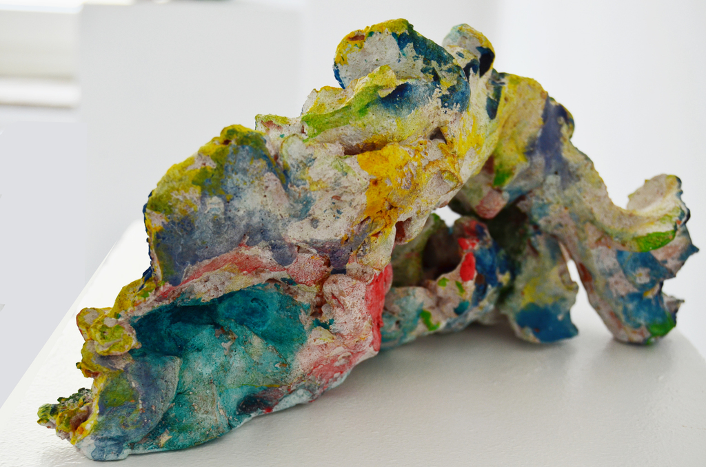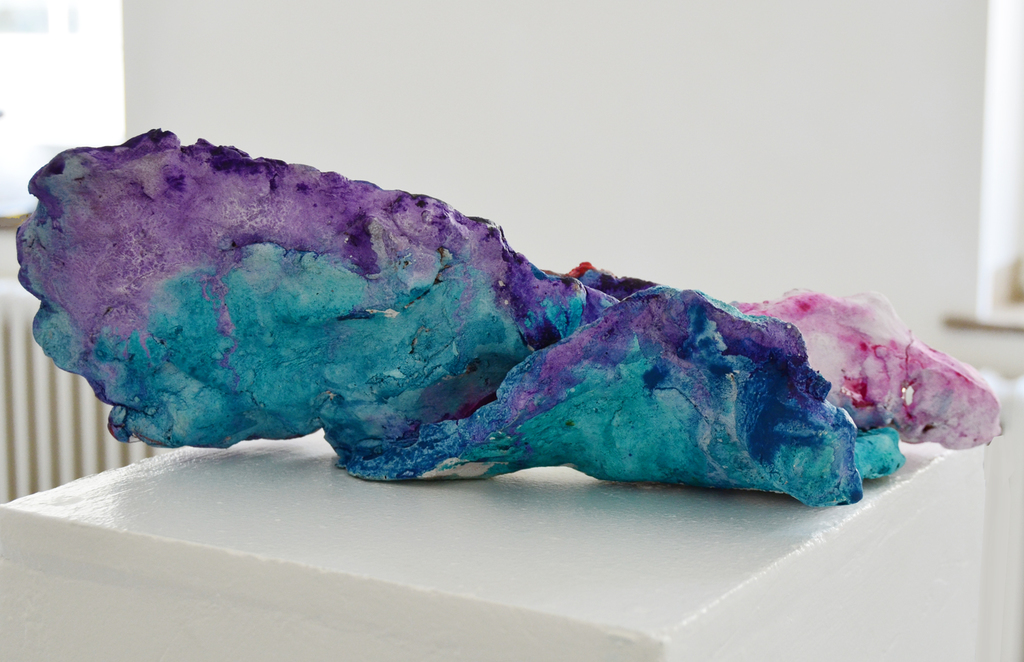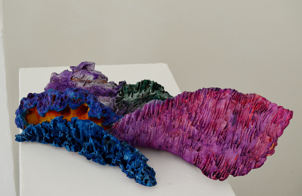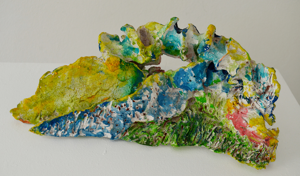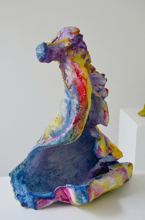Die Bildwelten werden angereichert und ergänzt durch Pflanzengebinde aus schnell geformten Flächen. Die Farben wurden in den weichen Gips gemalt. Die persönlich neu interpretierten Urformen verwandeln sich aus linear zusammengesetzten Zeichnungen in dreidimensionale Flächenkombinationen.Zügig gefertigt ergeben die Zusammenstellungen Urbäume, erinnern an religiöse, kontemplative Atmosphären in sakralen Räumen oder an Schöpfungsgeschichten in Glaubensgefügen.